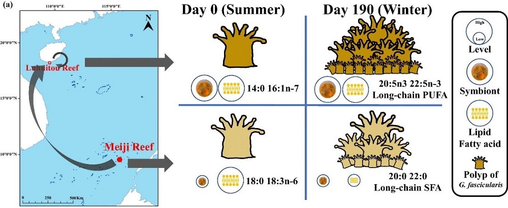 南海跨纬度的环境梯度背景下,探究珊瑚如何适应差异环境而生存,是了解南海珊瑚现有分布并预测其在气候变化下未来命运的基础。前期室内模拟实验发现南海广布物种丛生盔形珊瑚能够通过独特的生理权衡机制适应光照梯度差异(Yu et al,Coral Reefs,2023)。在此基础上进一步对其开展了跨区域(南沙→三亚,跨10纬度)的原位移植实验,从营养生态学角度揭示了其对环境差异的适应策略。结果表明,不同纬度来源的丛生盔形珊瑚对较高纬度低温和弱光环境具有不同的适应策略。在适应三亚鹿回头湾环境季节波动过程中,相比于来自南沙的丛生盔形珊瑚,三亚本地丛生盔形珊瑚的生理耐受性更强。从营养物质组成角度,揭示了三亚本地丛生盔形珊瑚能够通过调节脂肪酸结构(降低饱和脂肪酸占比,提高多不饱和脂肪酸占比)以适应环境季节波动的营养策略。而摄食能力较差导致脂类储存不足,及其对于关键功能脂肪酸合成途径的受阻,是南沙来源丛生盔形珊瑚无法适应三亚鹿回头湾环境季节波动的主要原因。因此,研究认为丛生盔形珊瑚对环境变化的耐受性取决于其本地适应的营养策略。此外,研究结果强调了热带典型造礁石珊瑚在短时间内可能无法轻易实现相对高纬度区域珊瑚对季节性环境波动的快速适应,从而对全球变化背景下造礁石珊瑚“北移”的避难所理论提出质疑。