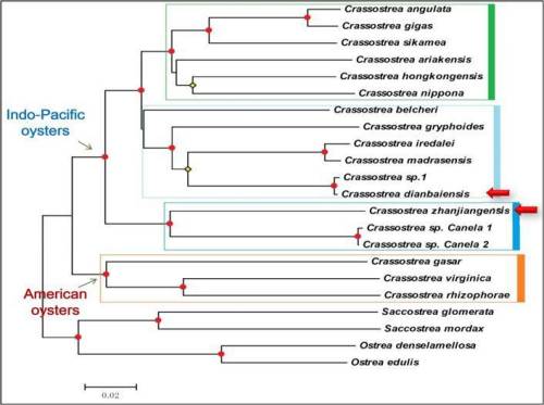 该研究得到国家现代贝类产业技术体系建设项目资助,相关成果在第五届国际牡蛎学术研讨会上作大会报告。分子系统学成果发表于《Gene》“New features of Asian Crassostrea oyster mitochondrial genomes: A novel alloacceptor tRNA gene recruitment and two novel ORFs”(2012, 507: 112-118.);新种报道发表于今年《Aquatic Living Resources》 :“Mitochondrial DNA and morphological identification of Crassostrea zhanjiangensissp. nov. (Bivalvia: Ostreidae): a new species in Zhanjiang, China”(2013, 26: 273-280)。