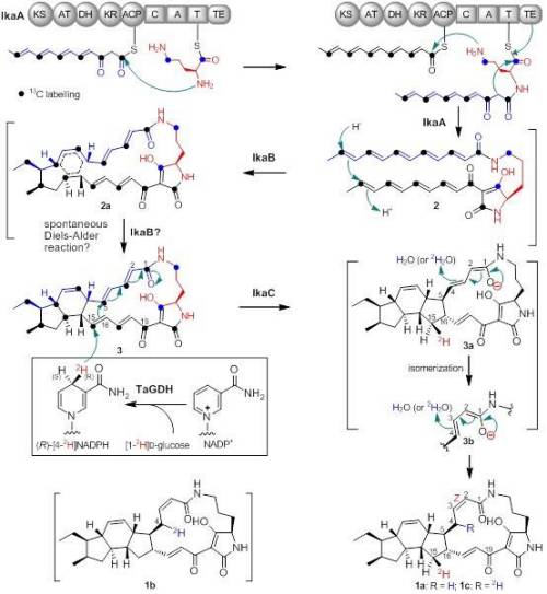 斑鸠霉素是PTMs家族的代表性化合物,其独特的结构和优良的抗肿瘤活性吸引了化学家和生物学家的广泛关注。研究人员从珠江口沉积物来源的海洋链霉菌Streptomyces sp. ZJ306中发现了斑鸠霉素,发现与其它PTMs化合物一致,斑鸠霉素的生物合成源于聚酮合成酶和非核糖体肽合成酶(PKS/NRPS)的杂合途径。通过基因敲除及异源表达等分子生物学技术,确定了三个基因ikaABC足以介导斑鸠霉素的异源生物合成,同时初步阐明了IkaABC的功能及反应顺序(图1):(1)PKS/NRPS杂合酶IkaA推测负责化合物2的合成,其PKS功能域可重复利用两次,合成两个稍有不同的12碳侧链,和1分子鸟氨酸缩合形成化合物2,这个推测与13C同位素标记结果相符;(2)FAD依赖的氧化还原酶IkaB经推测催化C-10与C-11之间的碳碳连接,产物经自发或者IkaB催化的Diels Alder反应形成产物3;(3)NADPH依赖的脱氢酶IkaC催化独特的类似于Michael Addition的[1+6]加成反应,形成了斑鸠霉素的内部五元环,这个独特的还原环化反应机制通过体外生化和巧妙的氘原子标记实验获得了解析和证实(图1)。