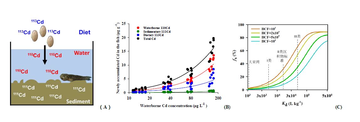 近期,中科院南海所张黎研究团队开发了一种多重稳定同位素示踪方法,在实验模拟体系中人为添加重金属镉同位素110Cd、111Cd和113Cd,首次对海洋底栖鱼类(诸氏鲻虾虎鱼,Mugilogobius chulae)从水相、沉积物相和食物相同步吸收镉的生物动力学过程进行量化分析(图A)。研究结果显示,该方法可有效的模拟预测虾虎鱼长期累积镉的动态变化(图B),可广泛适用于多种水生生物在复杂重金属暴露场景中生物累积机制的研究。同时,研究发现,虾虎鱼从沉积物中吸收镉的能力很低,仅为从海水中吸收镉的能力的万分之一。在该实验条件下(模拟未受镉污染情况,如大亚湾部分站位),虾虎鱼体内仅有约5%的镉来自于沉积物,而大部分的镉来自于海水和食物。然而,随着鱼类生活环境中沉积物镉浓度的升高,鱼将从沉积物获得更多的镉(图C)。在镉的沉积物/水相分配系数大于6 × 104 L kg-1(接近于我国三类沉积物标准)的环境中,沉积物贡献了鱼体内超过50%的镉。该研究结果表明,受重金属污染的海洋沉积物会导致底栖鱼类体内重金属的高累积。而底栖鱼类是海洋生态系统的重要组成,也是我国重要的渔业资源,因此,对受污染的沉积物进行人工修复,降低重金属的水平或生物可利用性,对于生态健康和渔业资源保护都有重要意义。