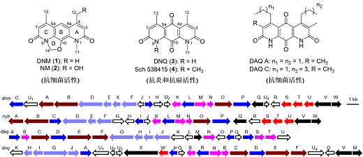 图1. 氮杂蒽醌类天然产物与其生物合成基因簇
