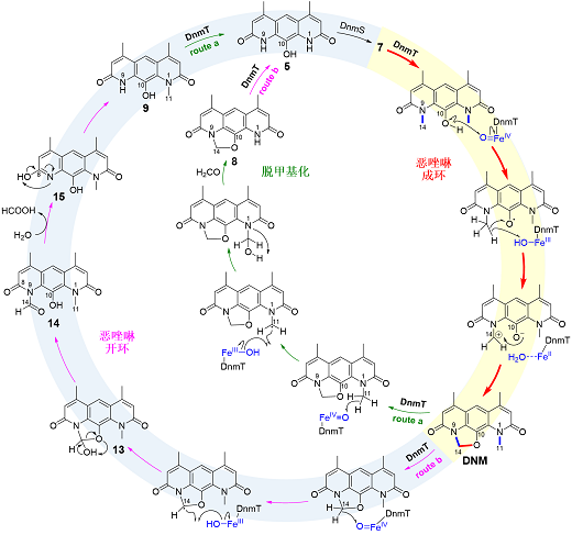 恶唑啉是天然药物中的重要活性基团,在有机合成小分子活性化物结构衍生和修饰中有着广泛应用。2-恶唑啉环是自然界中常见的结构形式,其在非核糖体肽、核糖体肽和苯并恶唑类天然产物中的生物合成途径已经阐明。抗生素DNM和NM是自然界中罕见的含有4-恶唑啉基团的氮杂蒽醌类化合物。DNM具有显著抗革兰氏阳性菌活性,也是开发抗革兰氏阴性菌的药物先导化合物,其作用机制是与DNA Ⅱ型拓扑异构酶靶向结合,阻碍细菌DNA合成而发挥抗菌作用。DNM中的4-恶唑啉环是关键药效团,但其生物合成机制一直是未解之谜,限制了对这类活性氮杂蒽醌天然产物的深度挖掘和开发利用。