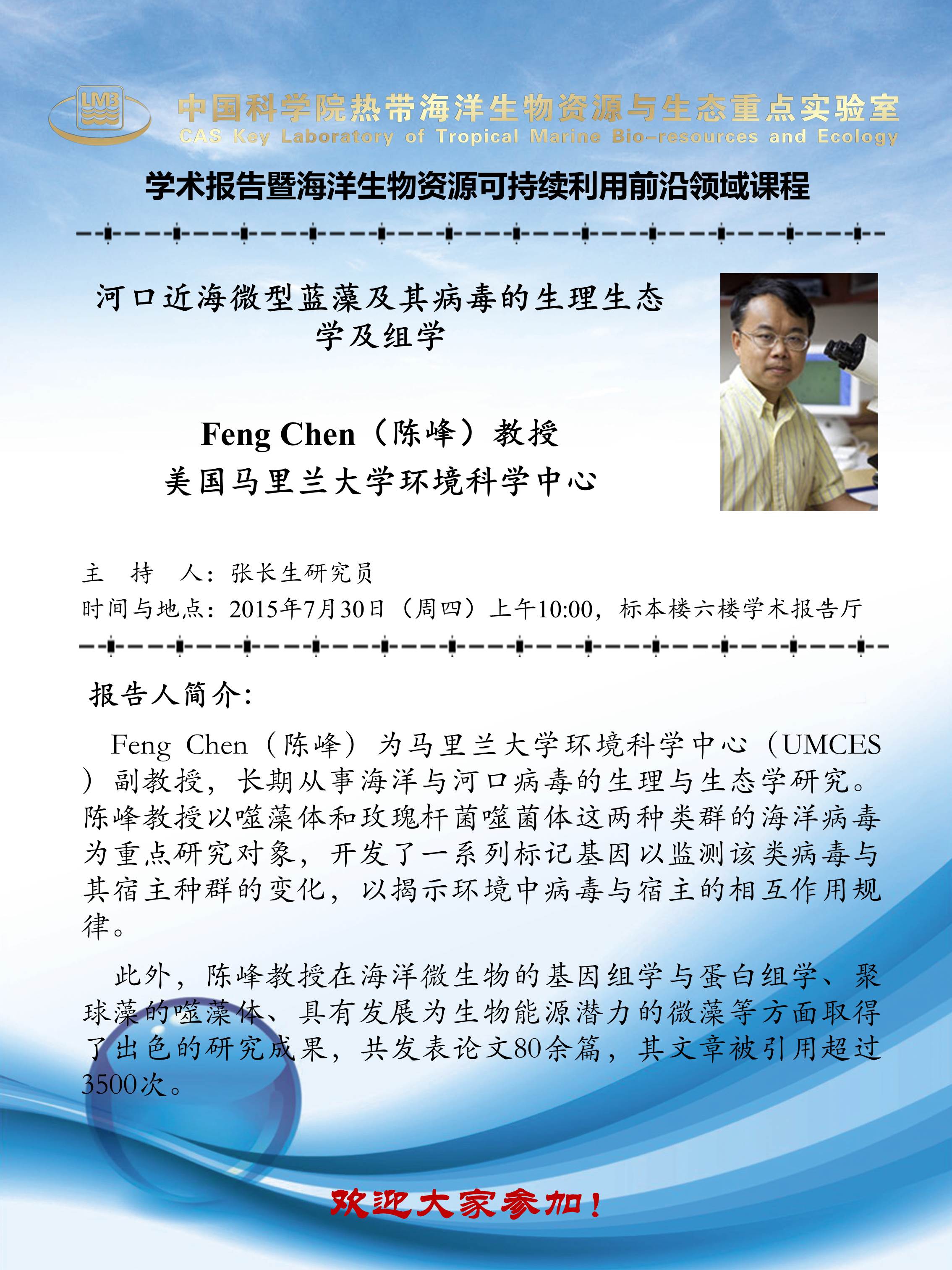 【LMB学术报告通知】7月30日_2015-10_陈峰副教授_河口近海微型蓝藻及其病毒的生理生态学及组学
