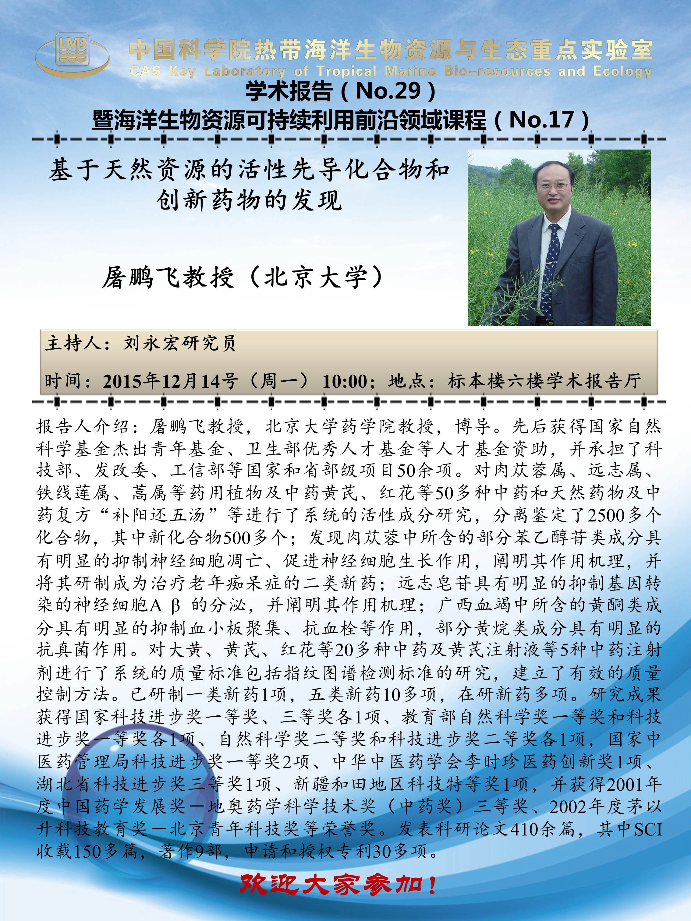 【LMB学术报告通知】12月14日_2015-29_基于天然资源的活性先导化合物和创新药物的发现